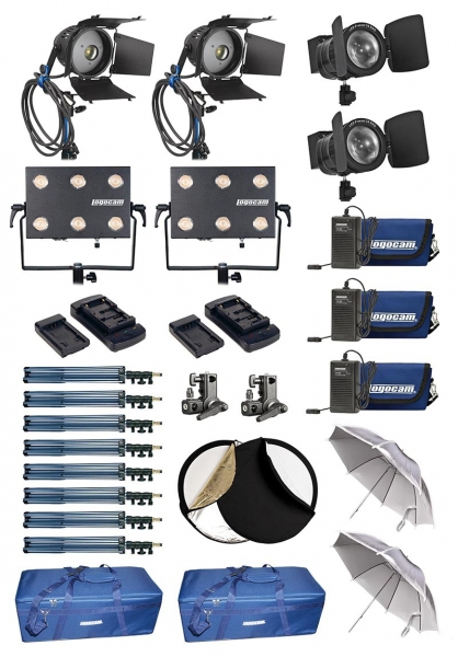 Автономный универсальный комплект выездного света Logocam A-LED 1900 DIM KIT оптимален для работы, на выезде или в любом месте, где работа от сети нежелательна или невозможна. Состоит из двух компактных универсальных светодиодных светильников Logocam LED Light mini U (56) со световым потоком, эквивалентным мощности галогенного светильника 800 Вт, и двух светодиодных прожекторов с линзой Френеля Logocam LED Fresnel 20 со световым потоком, эквивалентным мощности галогенного светильника 130 Вт, а также двух профессиональных[ светодиодных светильников Logocam L-Sport 30 (56) со световым потоком, эквивалентным мощности галогенного светильника 300 Вт. Наличие двух зонтов и двух рефлекторов дает дополнительную возможность более тонкой настройки освещения. В качестве автономного источника электроэнергии используются 6 комплектов электропитания PK3(X) и аккумуляторы Logocam UPL-65. Возможна работа от сети 220 В (источники питания идут в комплекте). Поставляется в транспортировочном кофре с водоотталкивающей пропиткой. Этот осветительный комплект может быть использован для решения любых осветительных задач. Время автономной работы составляет 2 часа.