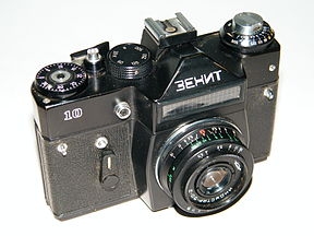 ОписаниеФотоаппарат Зенит-10 является представителем семейства советских однообъективных зеркальных фотокамер, выпускавшихся заводом КМЗ (Красногорский механический завод). В период с 1981 по 1982 год было изготовлено 19 865 фотокамер данной модели.Технические характиристики фотоаппарата Зенит-10 во многом совпадают с моделью Зенит-Е. Фотоаппарат Зенит-10 имеет литой алюминиевый корпус, открывающаяся задняя стенка оснащена скрытым замком,сблокированным с рулеткой обратной перемотки. Камера включает механический, шторно-щелевой затвор с горизонтальным движением матерчатых шторок и выдержкой затвора трех типов — от 1/30 до 1/500 сек, от руки и длительной. Штативное гнездо перенесено в центр корпуса фотокамеры с резьбой ¼ дюйма. Характеристики