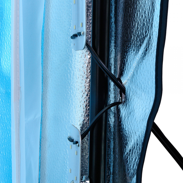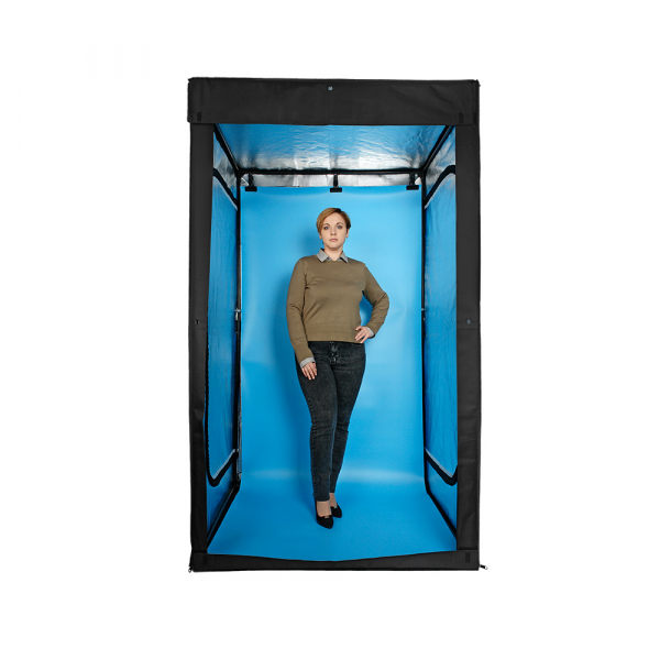Светодиодные линейки расположены по периметру осветителя внутри корпуса. Серебристые внутренние отражающие поверхности, быстросъёмные рассеиватели и постоянная яркость источников света создают интенсивное равномерное освещение и дают возможность проводить съёмку, не меняя каждый раз настройки фотоаппарата или камеры смартфона. Размер фотобокса позволяет фотографировать модель в полный рост.