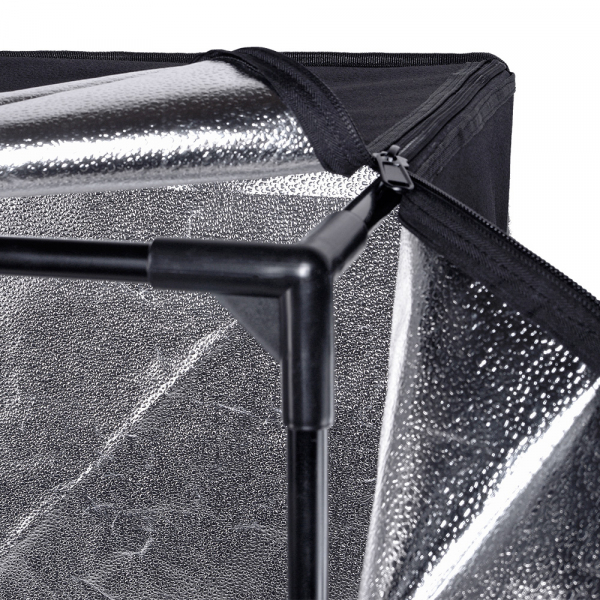 Фотобокс состоит из трубчатого каркаса и оболочки со светоотражающим слоем. Каркас собирается из стальных трубок и пластиковых соединителей. Оболочка имеет клапаны на молнии с обеих сторон, с помощью которых можно использовать дополнительные источники света (если хочется внести "художественный" акцент на изображение). На лицевой стороне оболочки имеется крепление (липучка) для светорассеивателя.