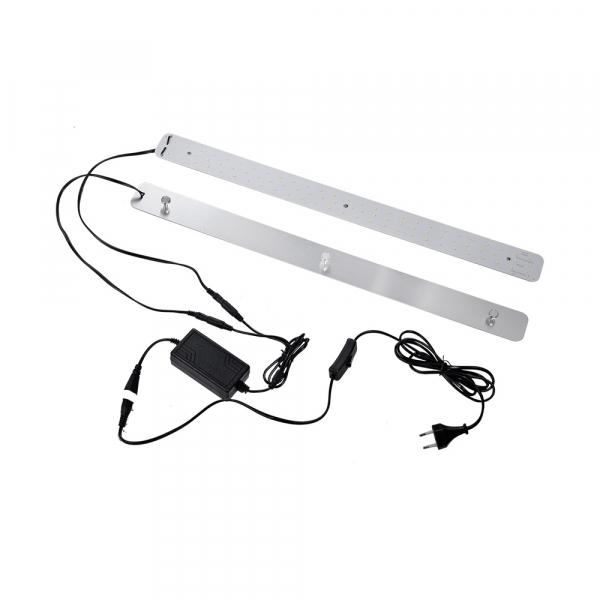 Светодиодные осветители крепятся на трубки каркаса с помощью мощных магнитов по двум боковым и одной верхней грани фотобокса. Питание светодиодных линеек осуществляется от сетевого адаптера, провод к которому продевается в отверстии оболочки. К одному адаптеру подключается две линейки одновременно. Для создания заполняющего света от линеек в комплекте предусмотрены два рассеивателя, крепление которых осуществляется к трубкам каркаса за счёт металлических крючков на резинке.