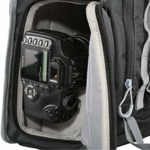 • Вместимость: зеркальная фотокамера с объективом + объектив / вспышка + мелкие аксессуары + планшет + монопод или штатив