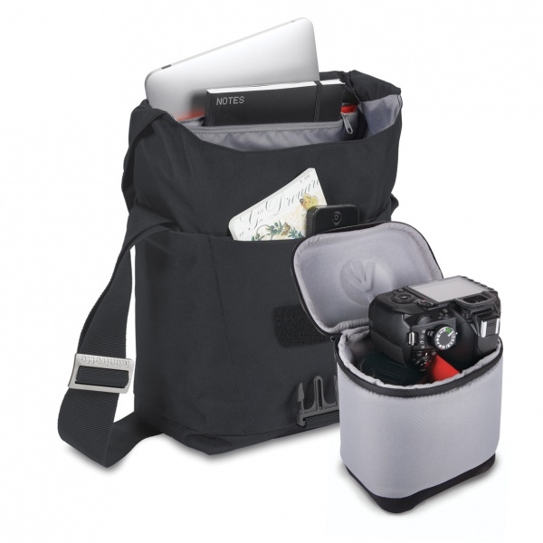 Стильная многофункциональная повседневная сумка для беззеркальной фотокамеры с установленным объективом и дополнительным объективом, 11` ноутбука, различных аксессуаров и личных вещей. Для сохранности оборудования предусмотрен жесткий кофр (16,5х15х10 см). Для ноутбука есть специальное отделение.