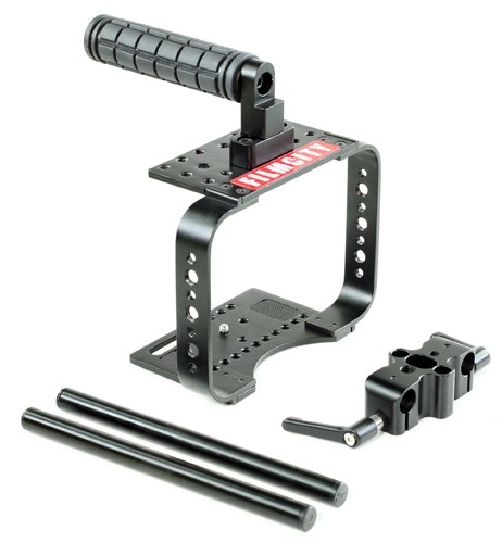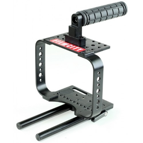 Конструкция каркаса Fimcity отличается тем, что плотно прилегает к камере. Каркас очень легкий. Он оснащен 20 отверстиями для винтов 1/4" и 16 для винтов 3/8". При желании можно на нем можно закрепить дополнительные стержни. 15-мм скоба находится на расстоянии 85 мм от объектива, она крепится к каркасу при помощи адаптера для установки на штатив.