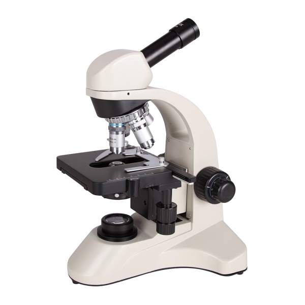 Монокулярная насадка поворачивается на 360°. При групповых наблюдениях вы можете просто развернуть насадку другому пользователю, не перемещая весь микроскоп. Насадка наклонена под углом в 45°, что обеспечивает максимальный комфорт при длительных изучениях. Микропрепараты размещаются на предметном столике и закрепляются на нем с помощью зажимов. Столик можно перемещать по вертикали и горизонтали при помощи отдельной ручки. Под предметным столиком размещается осветительная система микроскопа: светодиодная подсветка и конденсор Аббе с ирисовой диафрагмой. Подсветка имеет регулировку яркости, конденсор можно центрировать с помощью специальных рычагов. Вы всегда сможете подобрать оптимальные условия освещенности для изучения образцов.