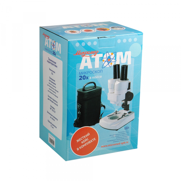 Микроскоп Микромед Атом 20x это портативный стереоскопический микроскоп, который позволяет рассмотреть увеличенное объемное изображение исследуемого объекта с высокой контрастностью, четкостью и большой глубиной резкости. Увеличение 20х Кратность микроскопа 20х позволяет изучить окружающий ребенка микромир - рассмотреть насекомых, листочки собранных растений, текстуру тканей, крупинки сахара и соли, волокна хлеба, кожуру и мякоть различных овощей и фруктов, и многое другое - объекты размером до 9 мм полностью помещаются в поле зрения этого прибора. Возможность установки цифровых камер Так же возможна работа с цифровыми камерами, специально предназначенными для микроскопов. Для того чтобы установить камеру на микроскоп, достаточно вытащить любой из окуляров и поместить камеру в освободившийся окулярный тубус. Исследования в отраженном и проходящем свете Подсветка работает в двух режимах – подсветка снизу или подсветка сверху. Микроскоп подходит для наблюдения прозрачных, непрозрачных и полупрозрачных объектов. Такие возможности увеличат кругозор юного исследователя. Жесткий футляр в комплекте В комплект входит жесткий футляр с ручкой и наплечным ремнем. Пластиковые дно, крышка и боковые поверхности обшиты черным мягким материалом. Снаружи водоотталкивающая синтетическая ткань. Крышка на молнии. Конструкция не позволит дождю попасть внутрь. Такой футляр очень важен – без него микроскоп не взять ни в машину, ни в «поле»! А с любыми оптическими приборами нужно обращаться бережно.