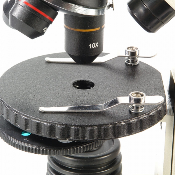 • Рукоятки грубой и тонкой фокусировки, расположенные по обеим сторонам штатива, обеспечивают точную настройку резкости изображения на большом увеличении. Рукоятки расположены на одной оси. Такая комфортная система фокусировки отличает этот микроскоп от других школьных моделей.