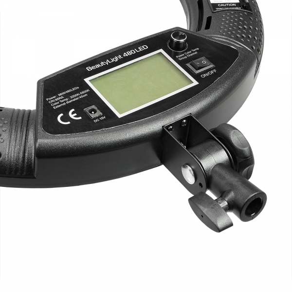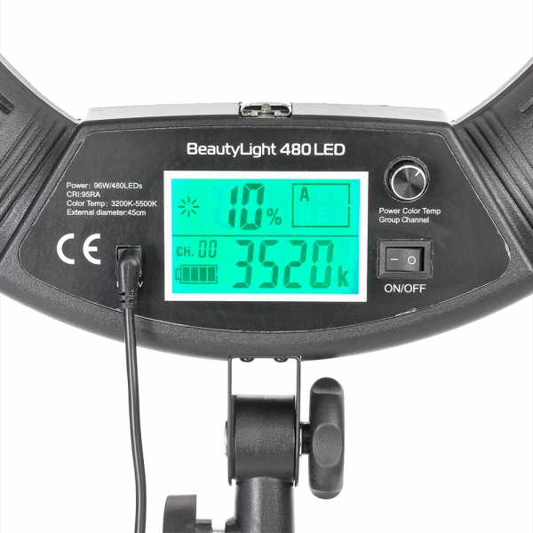 Светодиодный осветитель BeautyLight 480 LED представляет собой легкий и компактный осветитель с источником света в виде кольцевой панели диаметром 45 сантиметров с 480 светодиодами мощностью 96 Вт. Благодаря такой форме свет распределяется равномерно, освещая скрытые тенью участки.