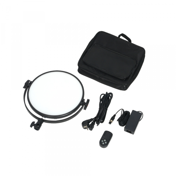 Мощный светодиодный осветитель GreenBean MoonLight 120 LED bi-color - круглая световая панель с изменяемой цветовой температурой. Источники света — 600 ярких SMD светодиодов с высоким уровнем цветопередачи (CRI более 95). Максимальная мощность — 67 Вт. В отличие от традиционно используемых софтбоксов, осветитель GreenBean MoonLight имеет абсолютно круглую матовую (через которую не видны излучающие светодиоды) поверхность, малые габариты и может создавать красивые круглые блики на глянцевых отражающих поверхностях. В осветителе используется две группы светодиодов с температурой 3200 К и 5600 К, каждая номинальной мощностью 60 Вт. Электрическая схема блока питания осветителя ограничивает общую мощность световой панели величиной 67 Вт. Установив (зафиксировав) необходимую мощность панели (максимум 67 Вт), пользователь может плавно менять цветовую температуру. Регулировка мощности бесступенчатая — от 10 до 100%