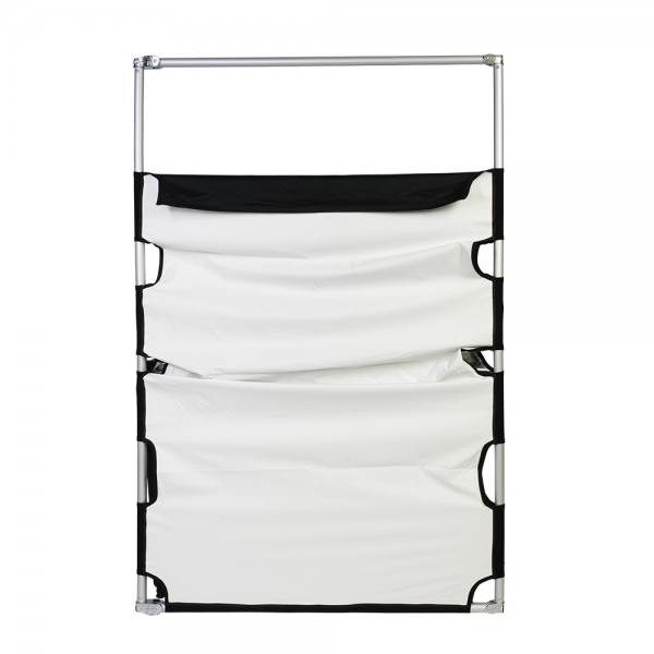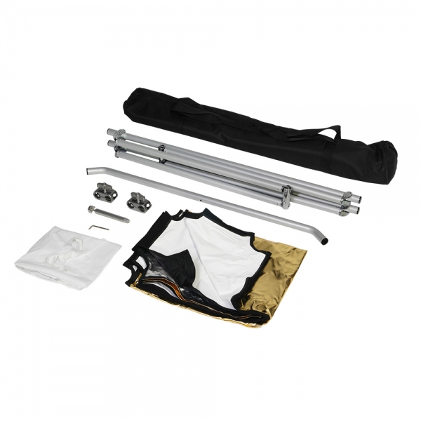 Чехол из просветного белого материала или чехол с четырьмя разными отражающими поверхностями натягиваются на собранную раму. Чехлы прошиты по периметру тесьмой и имеют отверстия для установки рукоятки-растяжки. Для установки отражателя на стенд или другой держатель, на С-образной рукоятке расположен установочный палец диаметром 17 мм.