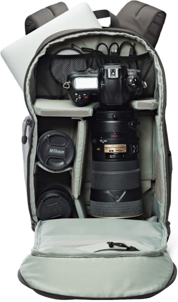 Рюкзак LowePro Transit Backpack 350 оснащен инновационной системой UltraFlex, которая представляет собой основную перегородку с множеством дополнительных. При ее использовании в сумке уместятся несколько небольших объективов. Если перегородку сложить, то пространство перестраивается таким образом, что в нем уже разместится один длиннофокусный объектив и несколько среднефокусных. Все перегородки можно убрать и использовать рюкзак как обычный городской и повседневный. Данное решение понравится городским фотографам и путешественникам, а так же фотографам, в арсенале которых находится внушительное количество различных объективов. Используя рюкзак или слинг серии Transit фотограф будет иметь выбор какой комплект объективов он возьмет с собой на съемку.