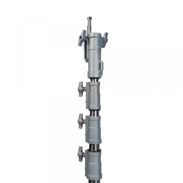 - Телескопическая колонна из 4 секций диаметром 45, 40, 35 и 30 мм надежно соединяются между собой металлическими винтовыми зажимами. Между секциями предусмотрены амортизирующие резиновые кольца.