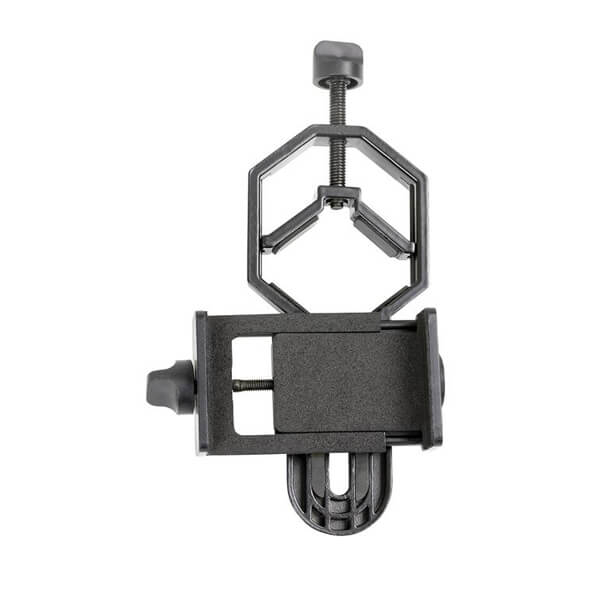 В комплект поставки входит адаптер для крепления смартфона Celestron, 1,25". С помощью этого удобного и простого в использовании адаптера для смартфона Вы можете делать снимки своих наблюдений практически с любого оптического прибора. Независимо от того, снимаете ли Вы Луну для Instagram через телескоп или зрительную трубу, или делитесь своими последними наблюдениями за дикой природой с помощью бинокля или зрительной трубы, или сохраняете лабораторные наблюдения с помощью своего микроскопа, этот универсальный адаптер легко справится со всем этим. Независимо от того, какой оптический прибор Вы выберете, установка и использование адаптера не вызовет у Вас трудностей. Сначала поместите свой смартфон в адаптер. Он надежно удерживается на месте с помощью зажимных винтов, которые фиксируют Ваш телефон на месте. Затем выровняйте камеру телефона по центру окуляра. После того, как вы добились идеального положения, зафиксируйте адаптер на окуляре оптического прибора.