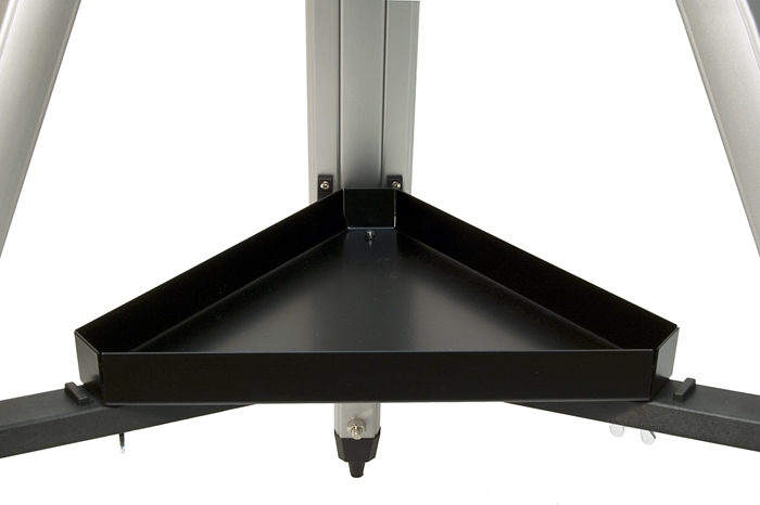 Монтировка устанавливается на алюминиевой треноге регулируемой высоты. Это позволяет обеспечить комфортную работу с телескопом для наблюдателя любого роста. Тренога снабжена удобной полочкой для принадлежностей, на которой во время наблюдений можно разместить карту звездного неба или неиспользуемые в данный момент окуляры.