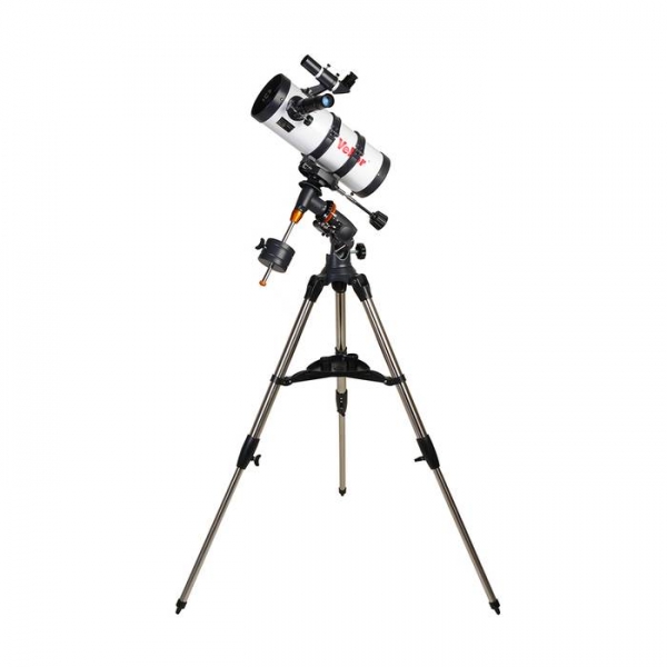 Телескоп Veber Polarstar 1000/114 EQ — оптимальная модель для серьезных, но начинающих любителей астрономии. Зеркало диаметром 114 мм достаточно велико, чтобы собирать много света (в этот телескоп вы сможете увидеть объекты солнечной системы во всех подробностях — таких как щель Кассини в кольце Сатурна, лунные кратеры размером ок.5 км, слабые звезды до 13 m зв. величины). Однако, габариты прибора вполне «домашние», длина трубы всего 42 см. С окуляром PL25 вы получите увеличение 40х, с которым удобно вести наземные наблюдения. При этом ближняя точка фокусировки составит всего 12 м. Очень стильное исполнение телескопа: белая глянцевая металлическая труба в обрамлении выглядящих брутально крышек, металлическая монтировка с декоративными оранжевыми элементами, мощный штатив из полированной нержавейки… Удобный 90 градусный искатель (увеличение 6х) расположен рядом с окуляром. Прибор оснащен монтировкой немецкого типа EQ5 с возможностью подключения электропривода (для постоянного наблюдения за выбранным объектом). Многие другие фирмы, в целях удешевления, устанавливают такие телескопы на монтировку EQ1, которая является для них откровенно слабой. Вся конструкция: