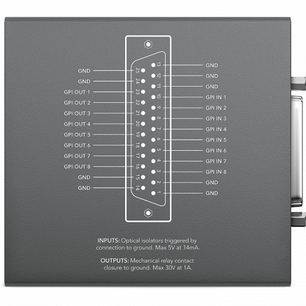 Интерфейсное устройство GPI and Tally Interface GPI and Tally Interface имеет по 8 входов и выходов для подключения к ATEM и роутерам Videohub. Tally-индикация активируется при включении статуса «on-air» на подключенном ATEM. Вы также можете увеличить количество входов и выходов, объединив несколько интерфейсов вместе. GPI & Tally-интерфейс может работать как контрольная панель Videohub, но без клавиш и LED-индикации. Теперь любой сотрудник студии сможет подключиться к роутерам Videohub для управления кроссировкой сигнала.