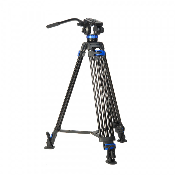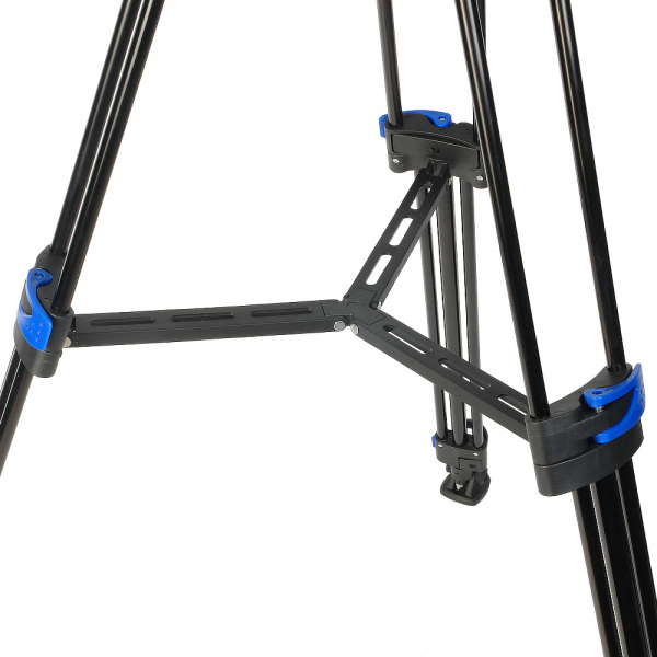 Складные ножки рамочной конструкции подавляют вибрацию, исключая колебания камеры, в том числе при вертикальном и горизонтальном панорамировании. Выполнены из алюминиевых трубок диаметром 15 и 20 мм, не подвержены коррозии. Каждая ножка регулируется отдельно, с учетом особенностей рельефа. Три секции ноги надежно фиксируются клипсовыми зажимами. Высоту штатива можно регулировать с 91 до 185 см. Усиливает жесткость конструкции верхняя поперечная растяжка. Штатив устойчив на твердом грунте или обледеневшей поверхности благодаря шипам на концах ног. Входящие в комплект резиновые опоры-башмаки обеспечивают хорошее сцепление с гладким полом. Точно расположить штатив относительно горизонта позволяет пузырьковый уровень.