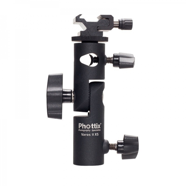 Держатель Phottix Varos XS При помощи данного крепителя можно просто установить и зафиксировать зонт под любым углом. Крепитель Varos II XS имеет крепление холодный башмак, обратимый адаптер с наружной резьбой 1/4” сверху, а также стандартную внутреннюю резьбу нижнего крепления 3/4”, и два центральных вставных крепления со внутренней резьбой 1/4” и 3/8”. Запатентованный крепёж для зонта обеспечивает надёжное и безопасное удержание рукоятки зонта. Серия Phottix Varos II служит идеально для систем беспроводных синхронизаторов работы удалённых вспышек Phottix Odin, Strato II Multi и Ares.